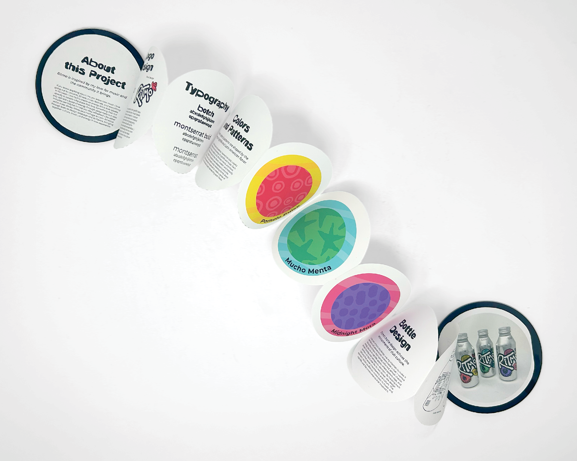 Ritmo is a conceptual branding and packaging project inspired by Latin-American yerba mate traditions and the electronic music scene. I developed a full visual identity system that reimagines mate as an energetic, party-oriented drink, using bold typography, rhythmic patterns, and vibrant colors to reflect the atmosphere of electronic music. The project includes custom bottle designs, a constructed dieline box, and a point of sale display. Through this work, Ritmo explores how design can translate music and cultural experience into a dynamic visual language.